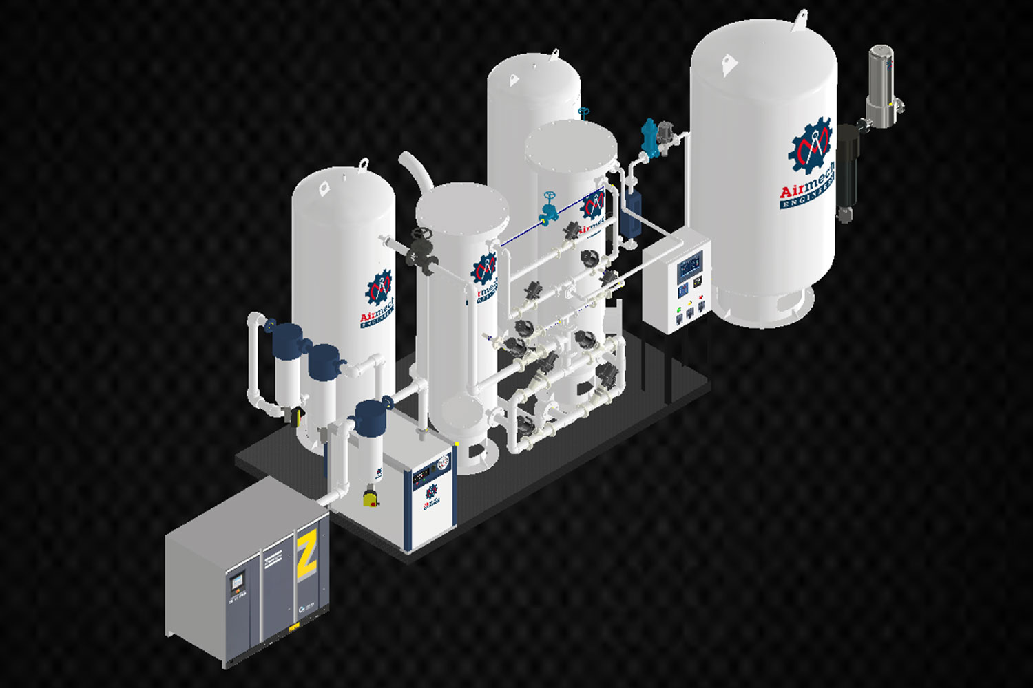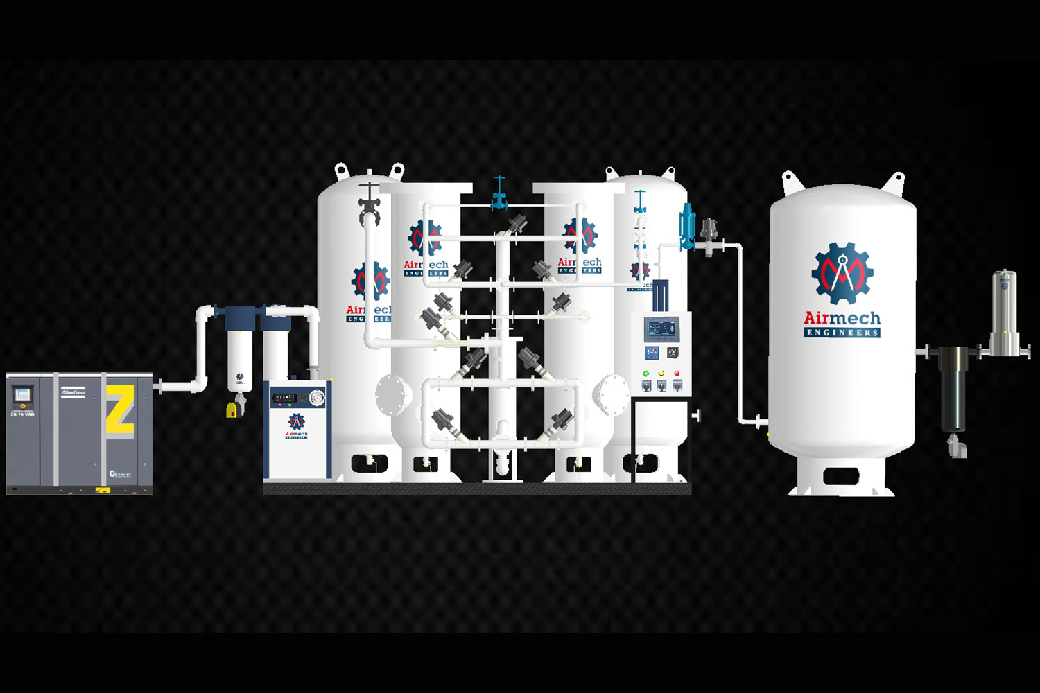 The Oxygen compressor in the VPSA, along with the buffer vessel, and the vacuum pump helps the VPSA Oxy-Generator to provide gas from as low as 0.3 to >4 bar pressure.
